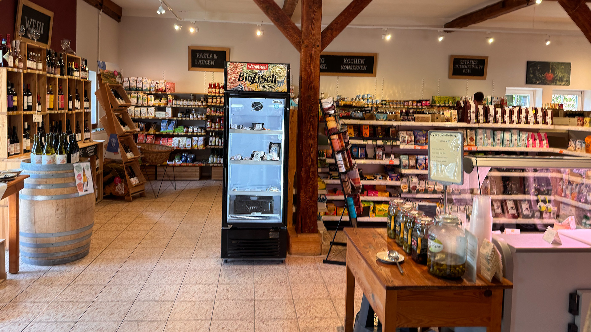 Natürlich lassen wir es uns nicht nehmen, direkt im Hofladen vorbeizuschauen. Von außen wirkt er eher unscheinbar, innen aber erwartet uns ein kleines Bio-Paradies: knackiges Gemüse direkt vom Feld, frisch gebackenes Brot, Käse aus der Hofkäserei, Wurstwaren, Eier, aber auch ein ganzes Regal voll mit Bauckhof-Produkten wie Müsli und Mehl. Alles duftet nach „echt“ und „handgemacht“.