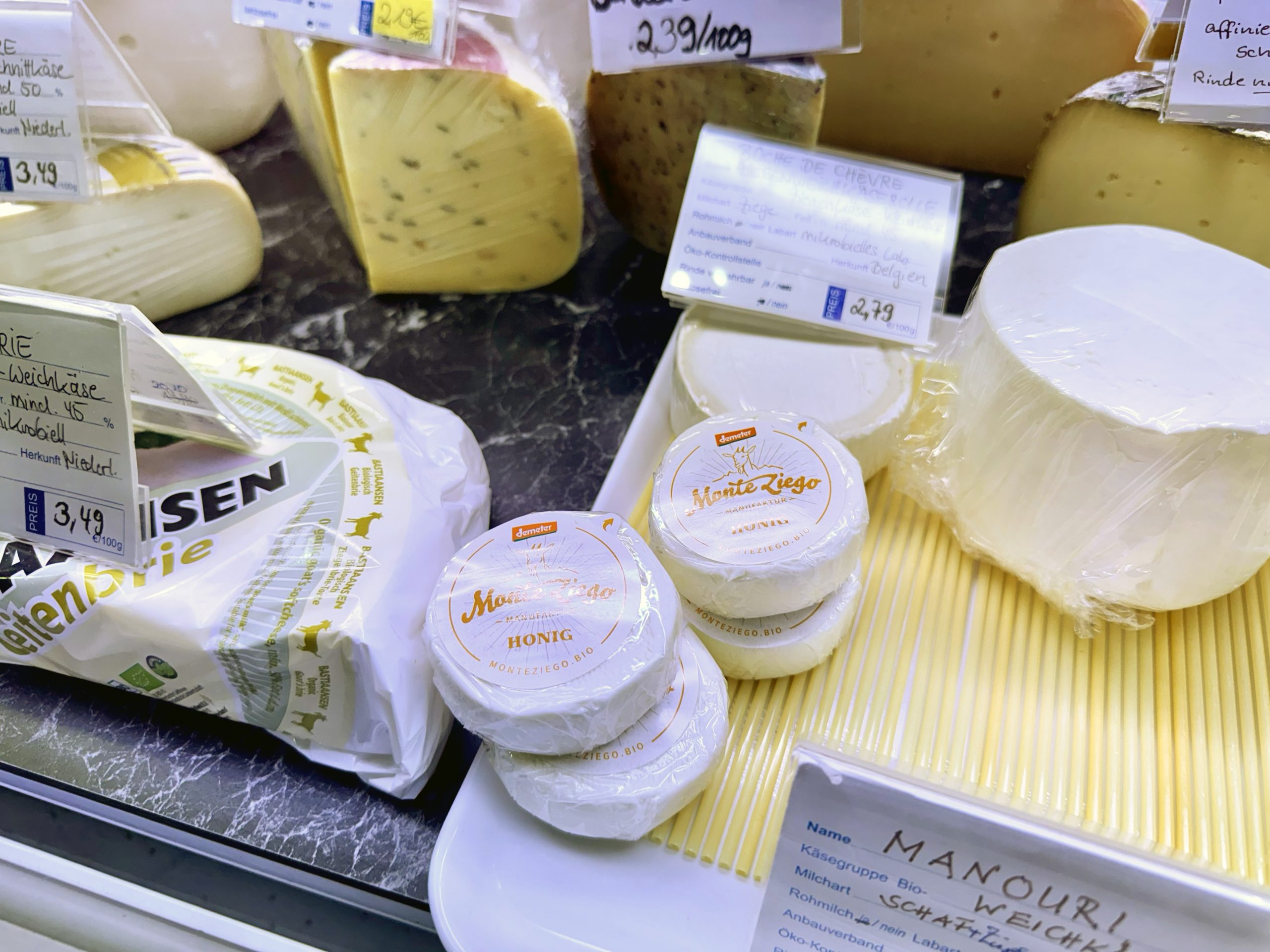 Handwerklich hergestellter Käse aus der eigenen Hofkäserei – wir könnten uns durch das ganze Sortiment probieren!