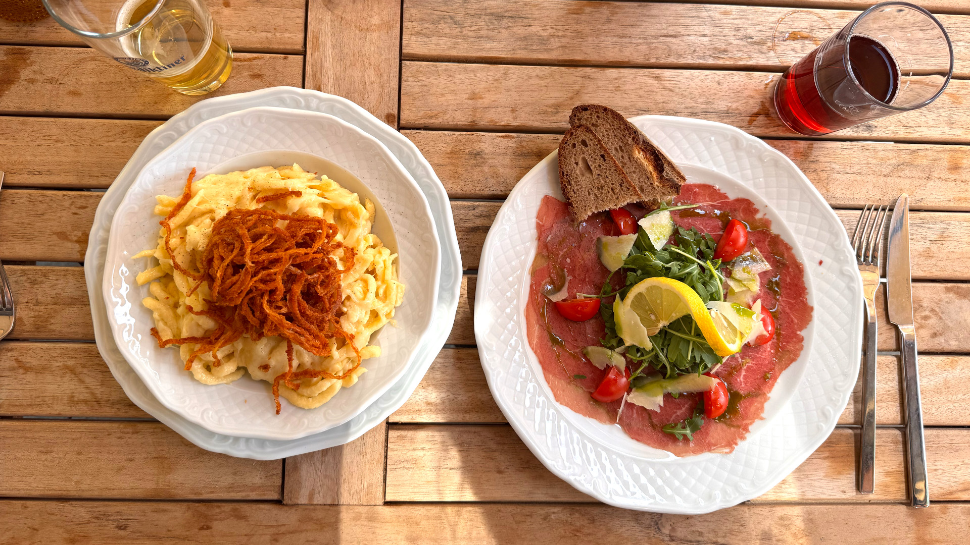 Spätzle mit Röstzwiebeln und feines Carpaccio.