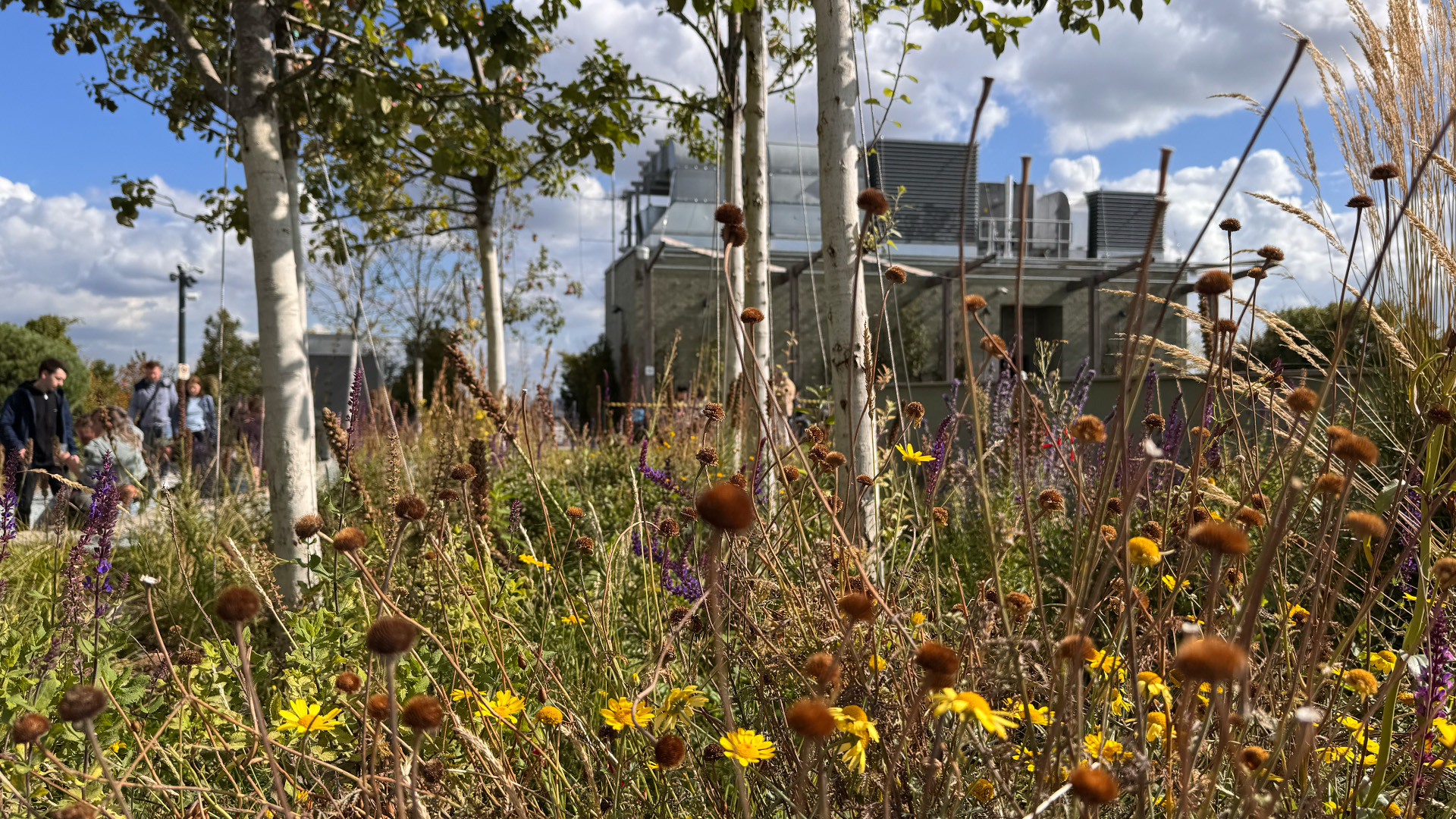 Oben angekommen erwartet Besucher ein Dachgarten mit Pflanzen, Rasenflächen, Sitzmöglichkeiten und Panoramablick.