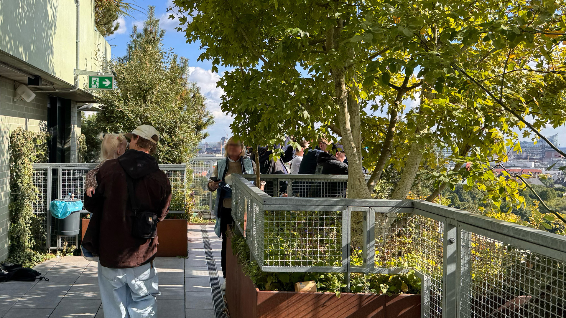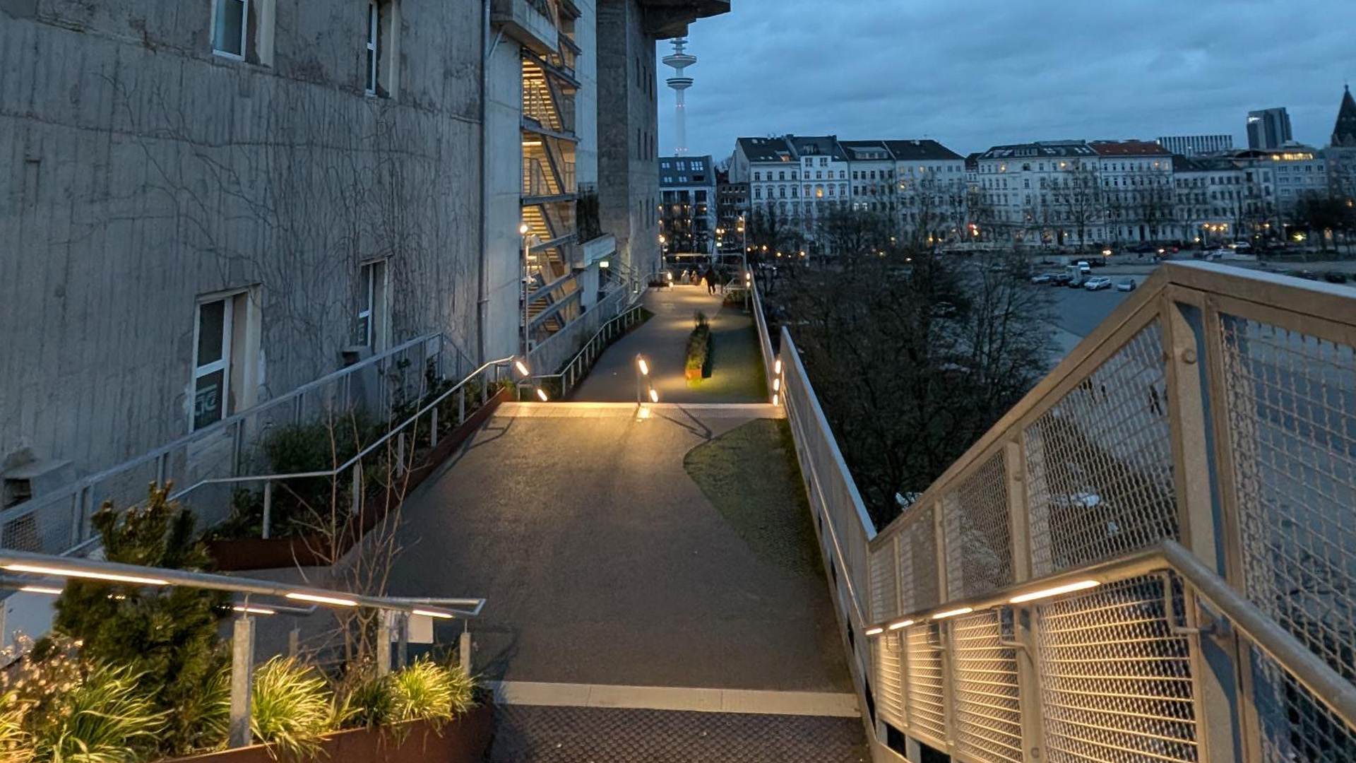 Oben angekommen, wurden wir sofort belohnt: Der Dachgarten ist atemberaubend. Über einen 560 Meter langen „Bergpfad“ schlängelt man sich durch die üppige Vegetation bis ganz nach oben. Von dort hat man einen grandiosen Blick über Hamburg – das Millerntor-Stadion, die Elbphilharmonie und die Dächer der Stadt breiten sich vor einem aus.
