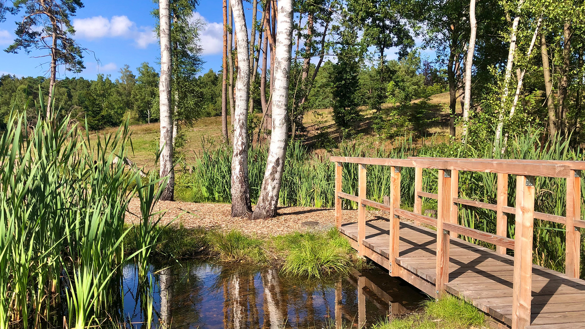 Kaum waren wir wieder draußen, standen wir bald wieder im Sonnenlicht auf weiten Heideflächen, zwischen Wacholderbüschen und schlanken Birken – ein echter Kontrast. Und dann: das Büsenbachtal! So idyllisch! Ein glasklarer Bach, kleine Teiche, sanfte Hügel und überall diese typischen Heidefläche.