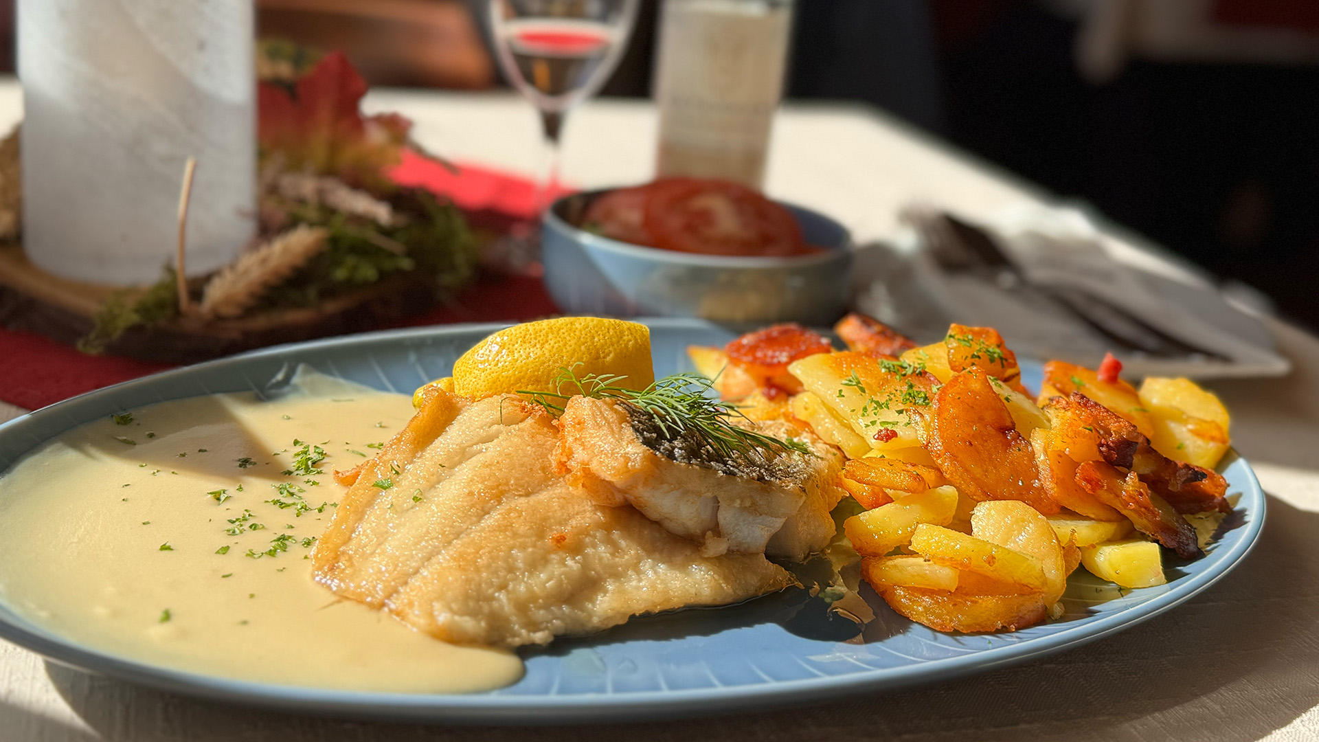 Die Speisekarte bietet eine feine Auswahl an norddeutschen Fischgerichten wie Stint, Maischolle, Matjes und natürlich Pannfisch – gern serviert mit kräftigen Bratkartoffeln. Wir entschieden uns für den traditionellen Pannfisch und wurden mit einer großzügigen Portion belohnt: zarter Fisch, perfekte Kartoffeln und die Senfsoße, ein Gedicht. Hinterher ein Schnaps und ein bisschen frischen Luft am Deich. Das tut gut!